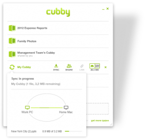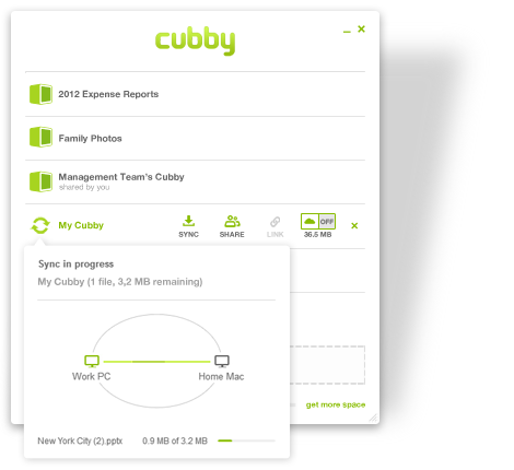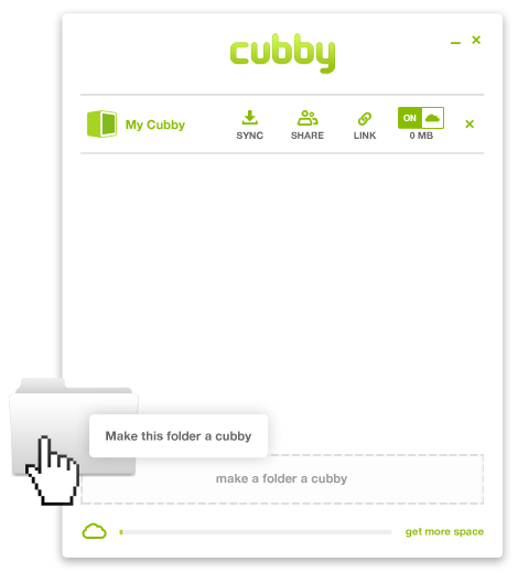 – Any Folder Sync – You can turn any folder into a cubby right where it is by dragging it over to the Cubby application or right-clicking it (PC). No need to change where it lives or how you work. Turn as many folders into cubbies as you like.